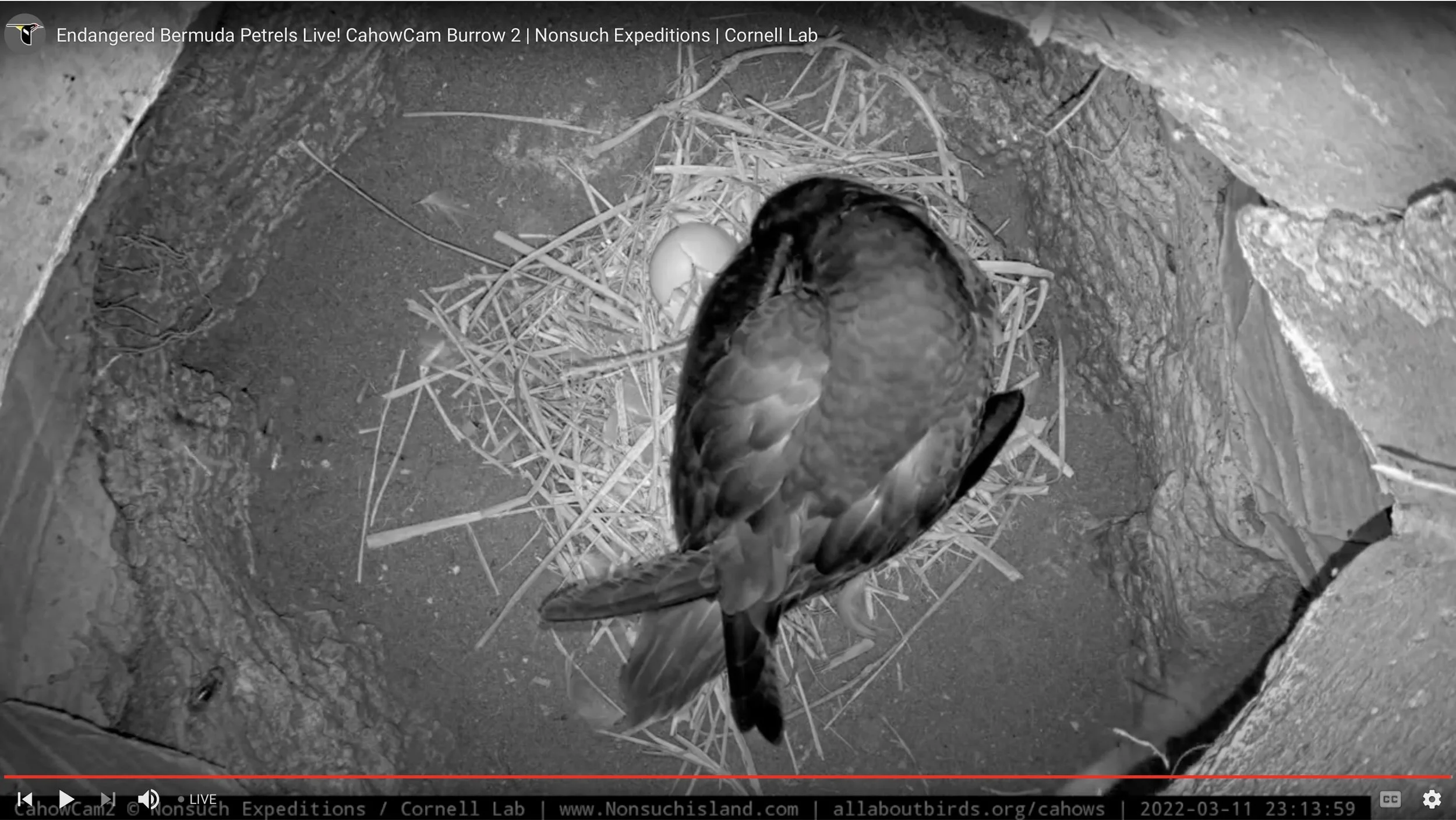 UPDATE March 7th: After dimples were first identified in the egg yesterday and the start of pips were observed by Jeremy today we are now on Hatch Watch for CahowCam 2 and if all goes well the full hatching is expected within the next 72hours.